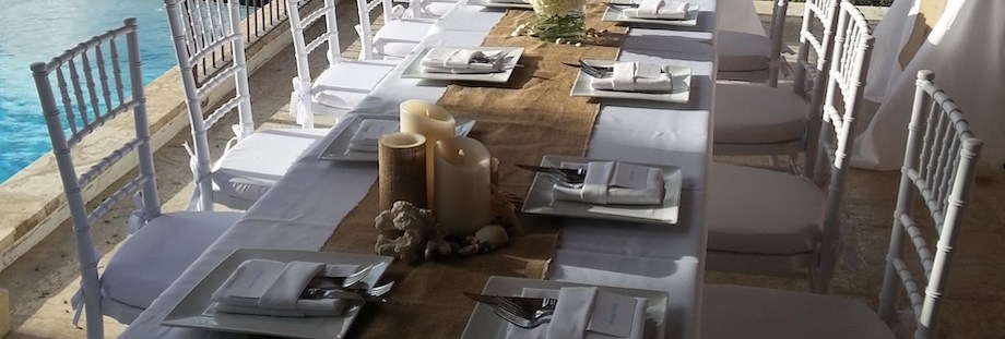 - Give the table a little lift. Make “risers” out of regular kitchen items like pots and pans, or boxes of dry goods from the pantry. Lay your first table cloth on the table. Then, place your “risers” in a staggered row across the center of the table, varying heights to create interest. Cover the risers in another cloth, gathering the excess at the bases to make a beautiful pool of fabric. When you present the dishes on the table, the varying heights will offer extra interest.
