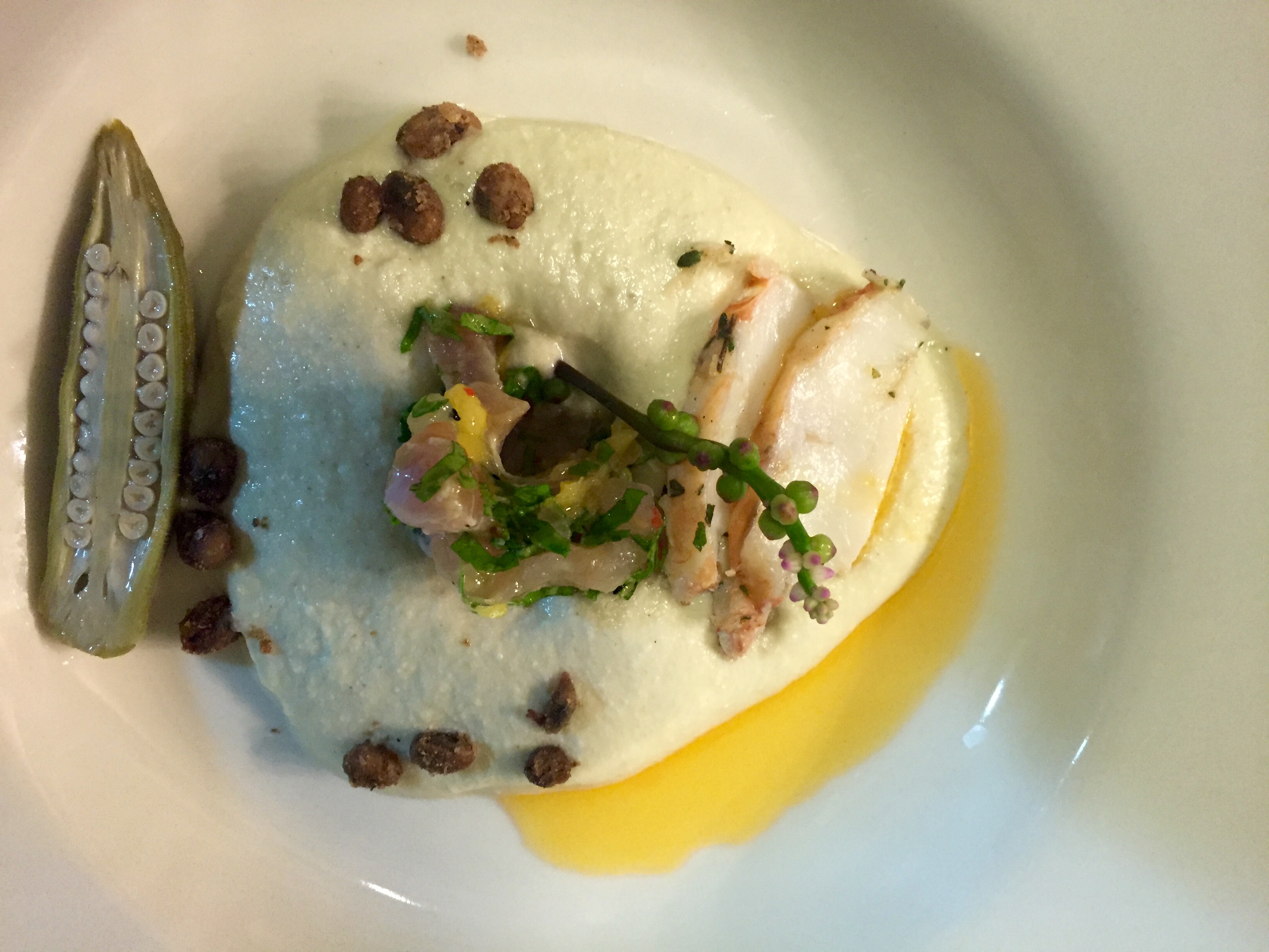 fullsizerender-3 Published October 18, 2016 at 3264 × 2448 in Robert Mondavi Full Moon Dinner ← Previous Next → First Course: Coconut Celeriac Vichyssoise – Grilled&Chilled Caribbean Lobster – Snapper Escabeche – Pickled Okra (from our garden) – Crispy Black-eyed Peas