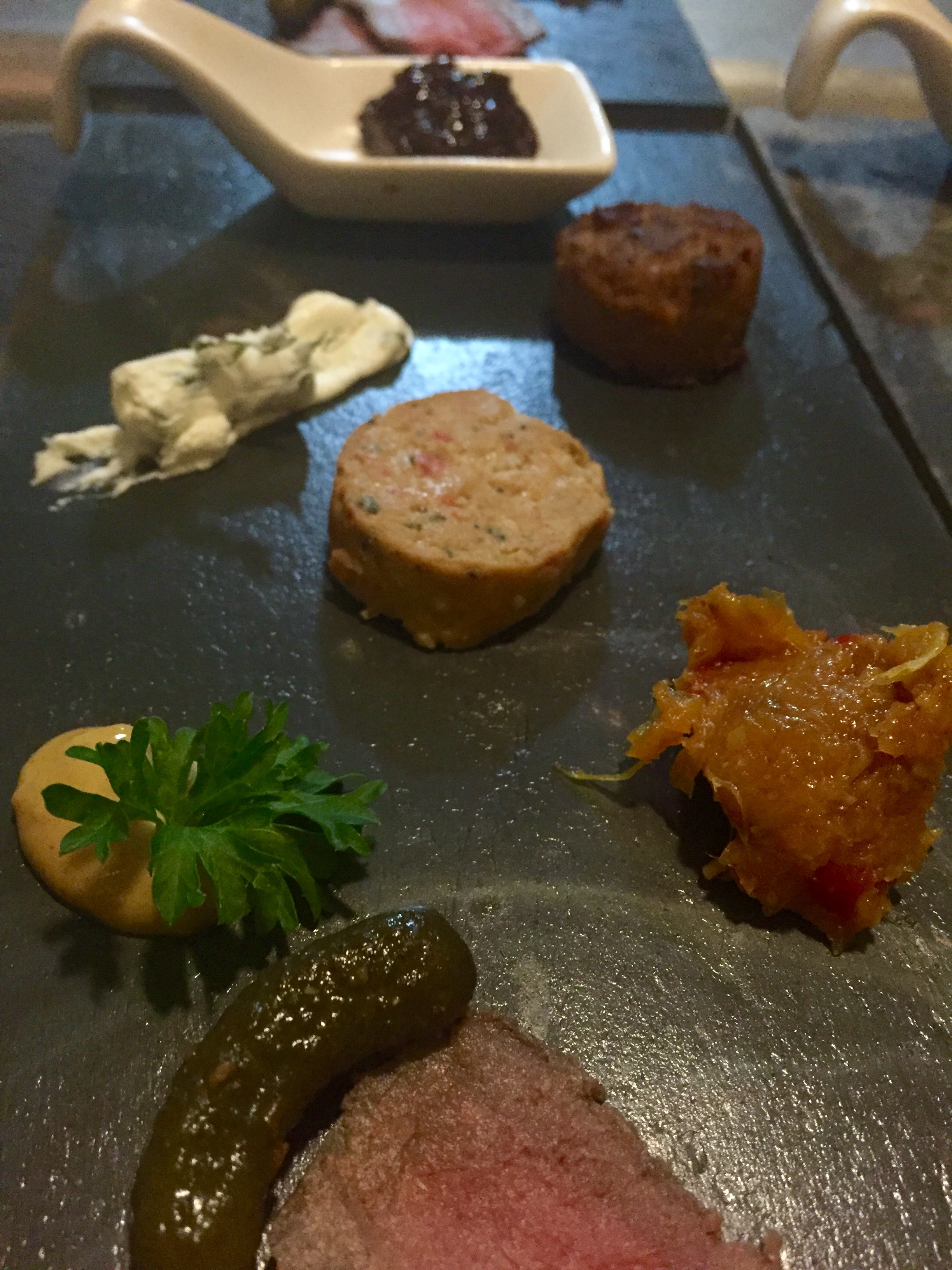 fullsizerender Published October 18, 2016 at 2448 × 3264 in Robert Mondavi Full Moon Dinner ← Previous Next → Windy Level October Full Moon with Robert Mondavi: Preservation (3rd) Course: Vension Pastrami – Hunter’s Jerky – Frog&Alligator Sausage – House Mustard – Jackfruit Jam – Grilled Bread