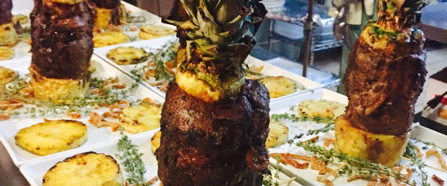 Chef Ben Lewis really wanted to take charge of this main dish, so we gave him free reign to cook the pork as he envisioned. Marinated slices of Pork Shoulder were layered and skewered, wrapped, then set in a water bath for 18 hours. After chilling it to retain it’s shape, they were then wedged in between Pineapple tops and bottoms, brushed with a spicy balsamic reduction, charred, and roasted to bring back to temperature. We served these standing up, surrounded by a nest of Grilled Pineapple, Fresh Thyme, and Chicharrones.