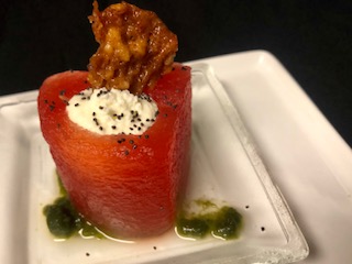 1st course watermelon salad Published November 9, 2018 at 320 × 240 in October’s Full Moon Dinner Benefiting the Family Resource Center ← Previous Next → First Course: Compressed Watermelon Salad