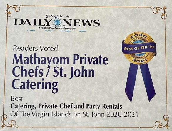 Mathayom Vacharat is the owner and head chef at Mathayom Private Chefs and St. John Catering and has been a resident of St. John since 1995, moving from Philadelphia after graduating Drexel University with a Business degree. Mat then attended the Graduate Program at the School of Hard Knocks, studying Improvisation. Opening the business in 2004, his experience as executive chef at premier fine dining restaurants on St. John lends his cuisine a breadth of influences ranging from Asian fusion to progressive American to Caribbean flair.