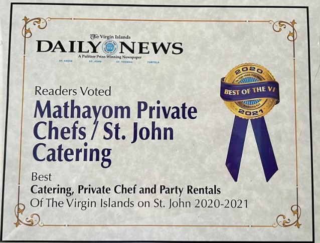 Mathayom Vacharat is the owner and head chef at Mathayom Private Chefs and St. John Catering and has been a resident of St. John since 1995, moving from Philadelphia after graduating Drexel University with a Business degree. Mat then attended the Graduate Program at the School of Hard Knocks, studying Improvisation. Opening the business in 2004, his experience as executive chef at premier fine dining restaurants on St. John lends his cuisine a breadth of influences ranging from Asian fusion to progressive American to Caribbean flair.